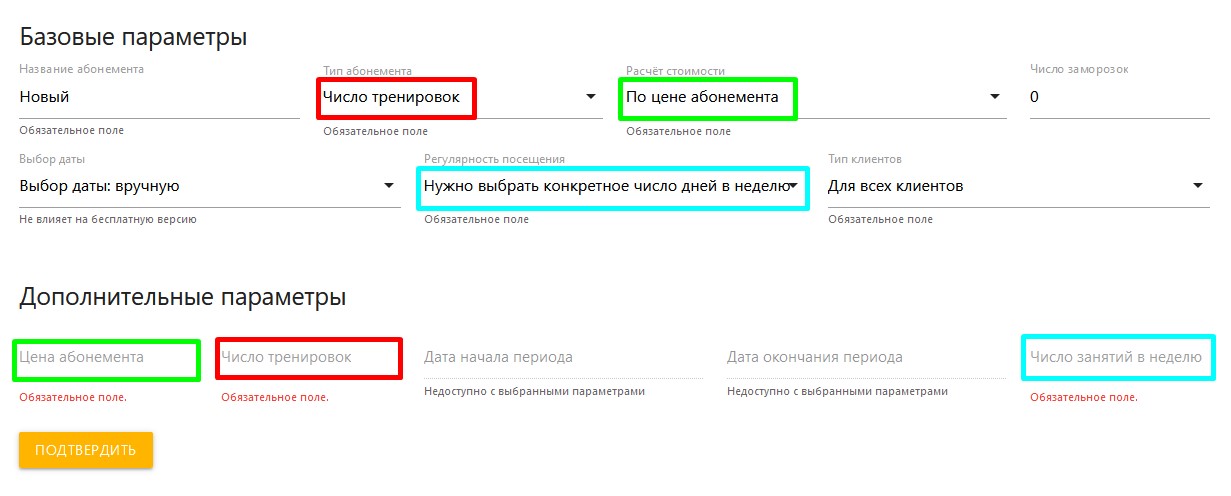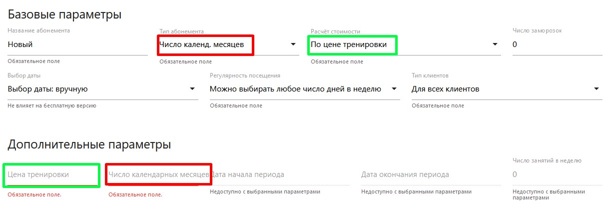 - В зависимости от выбора в поле тип абонемента вам надо заполнить число тренировок, число календарных месяцев или конкретный период